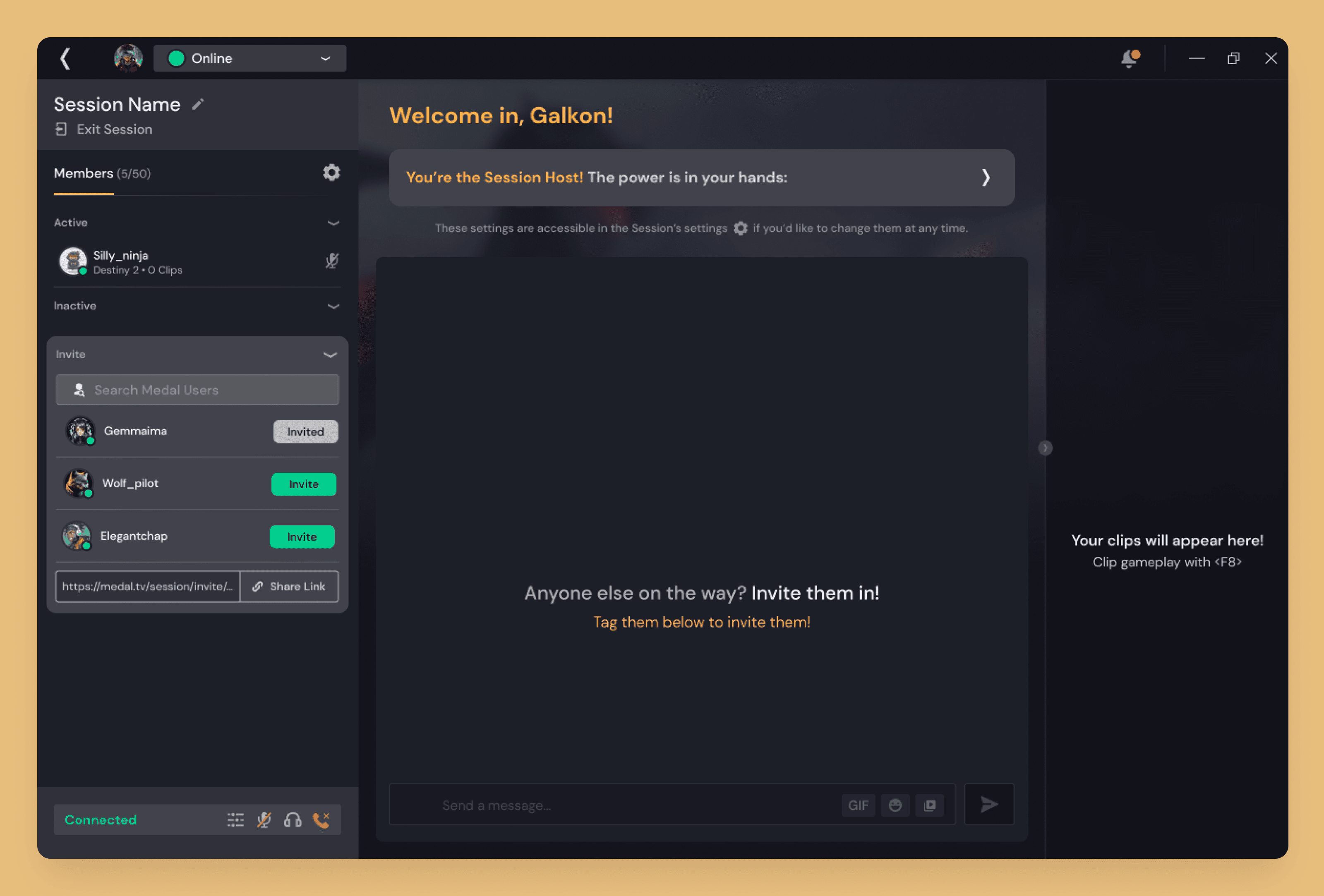 Easily take control and manage the settings of the session as well as keep track of all the clips you published from the session.