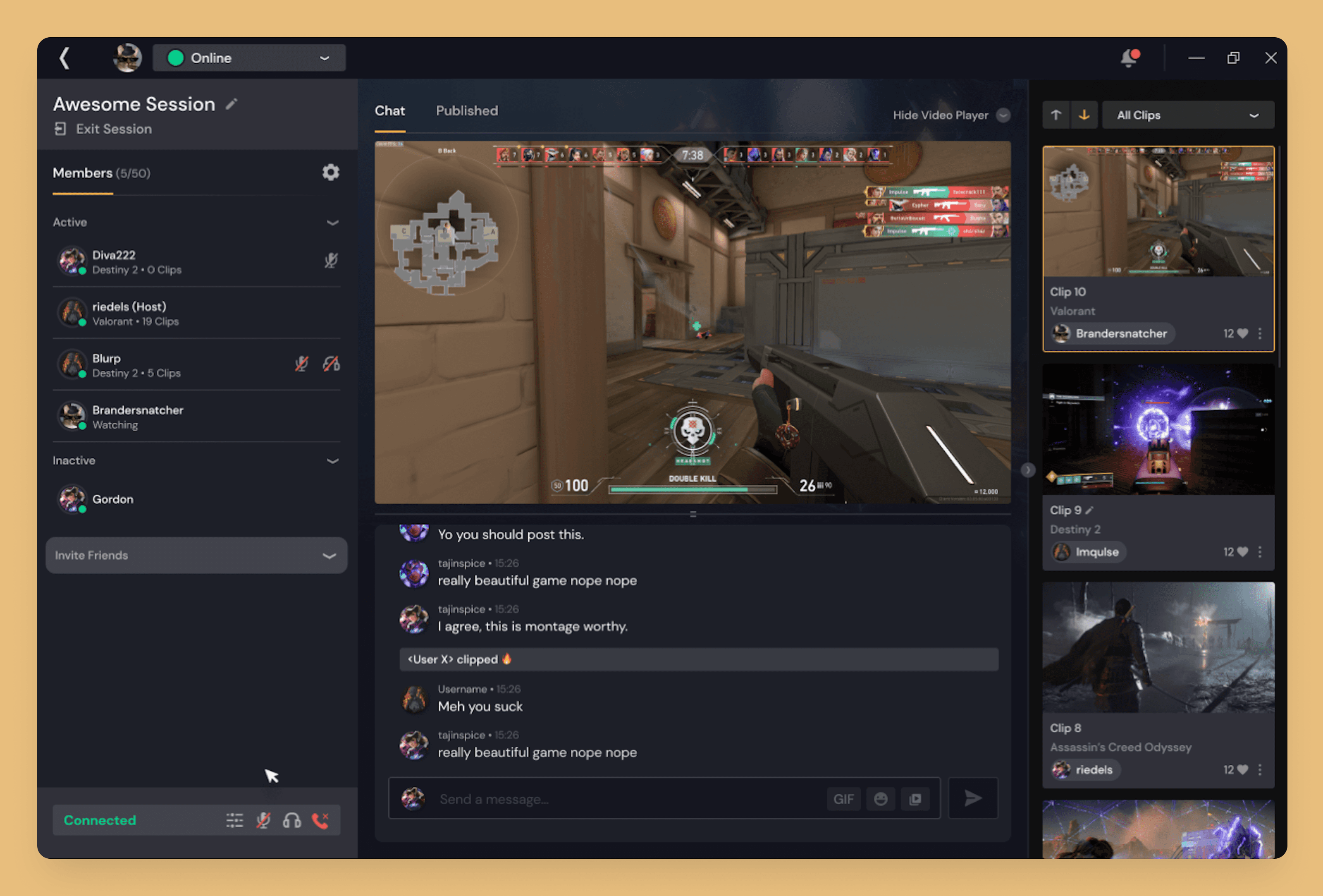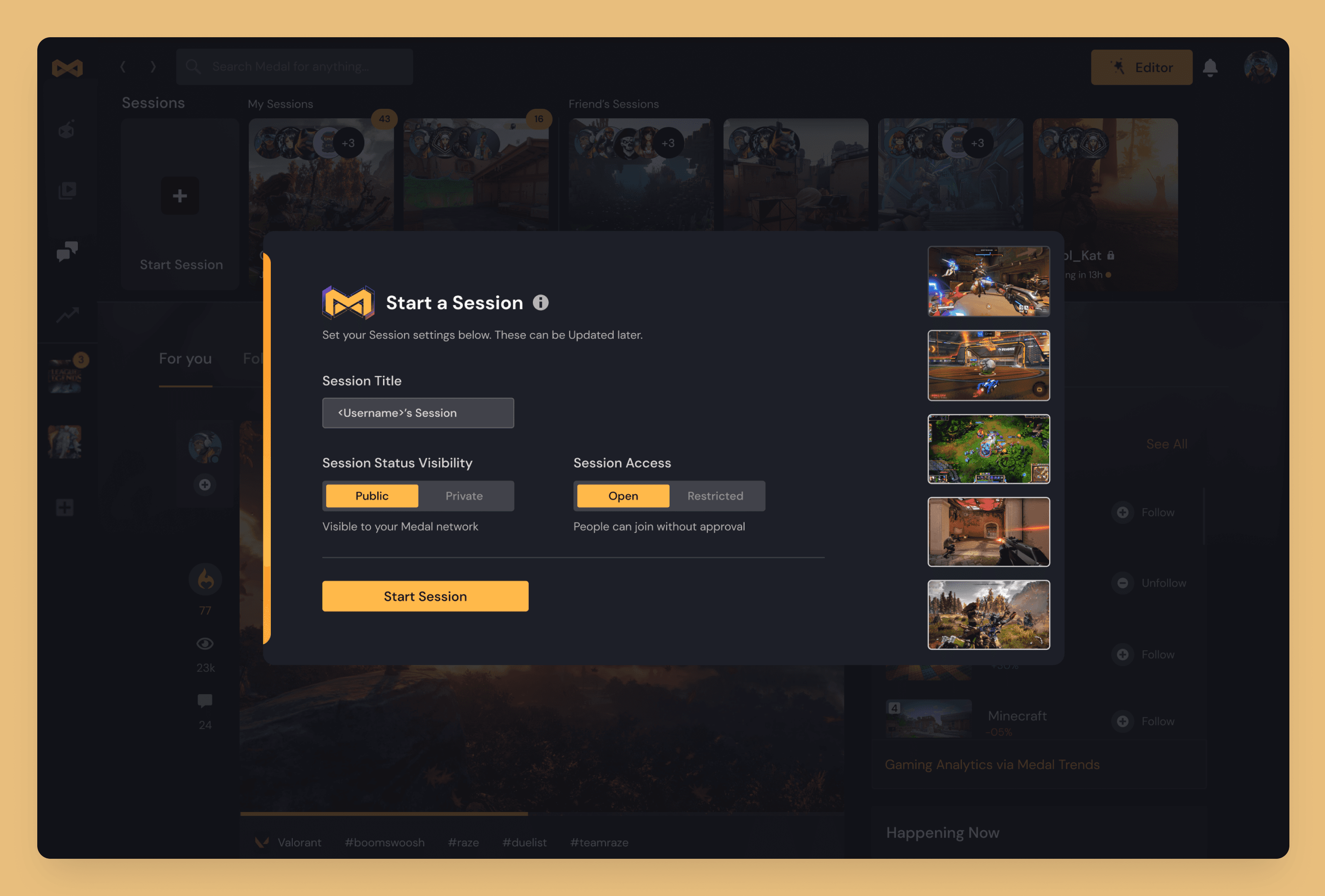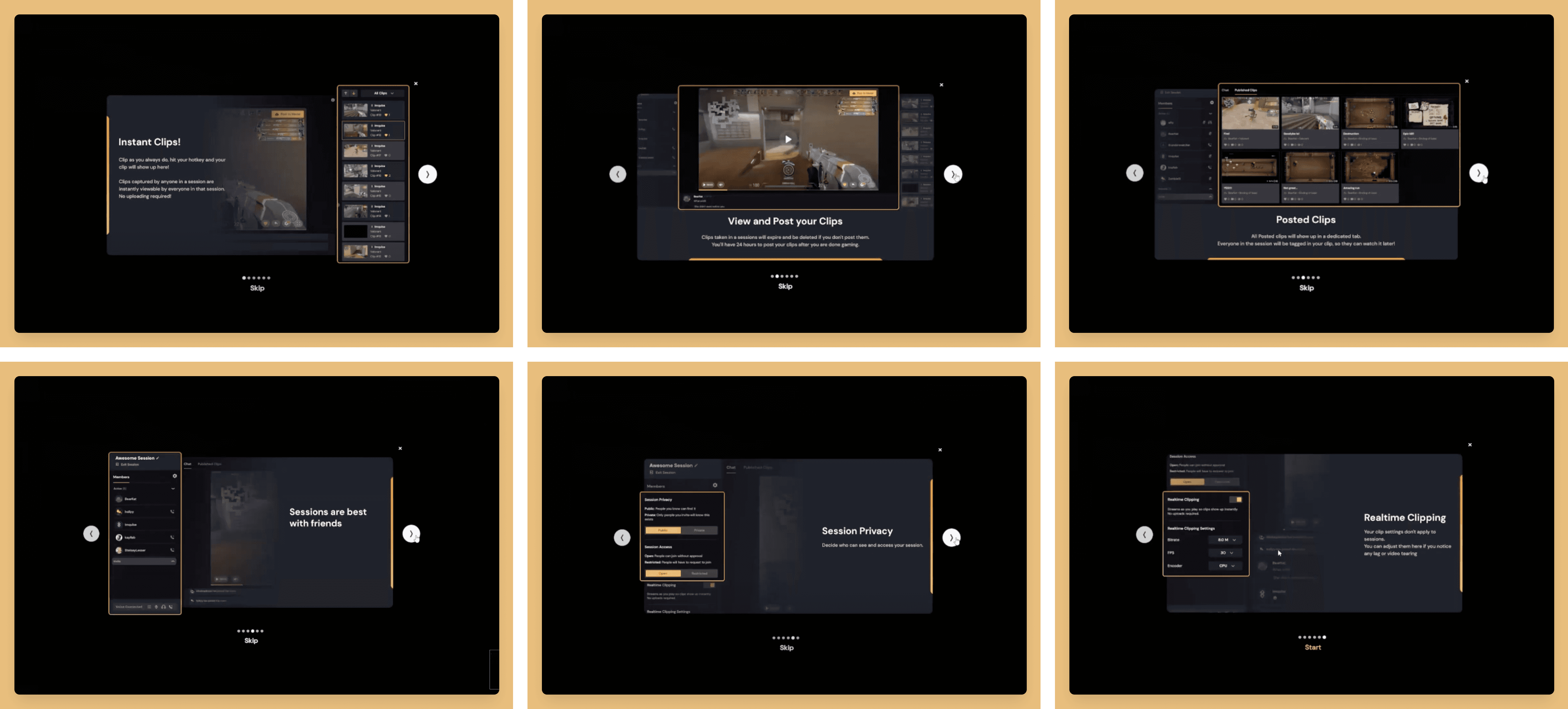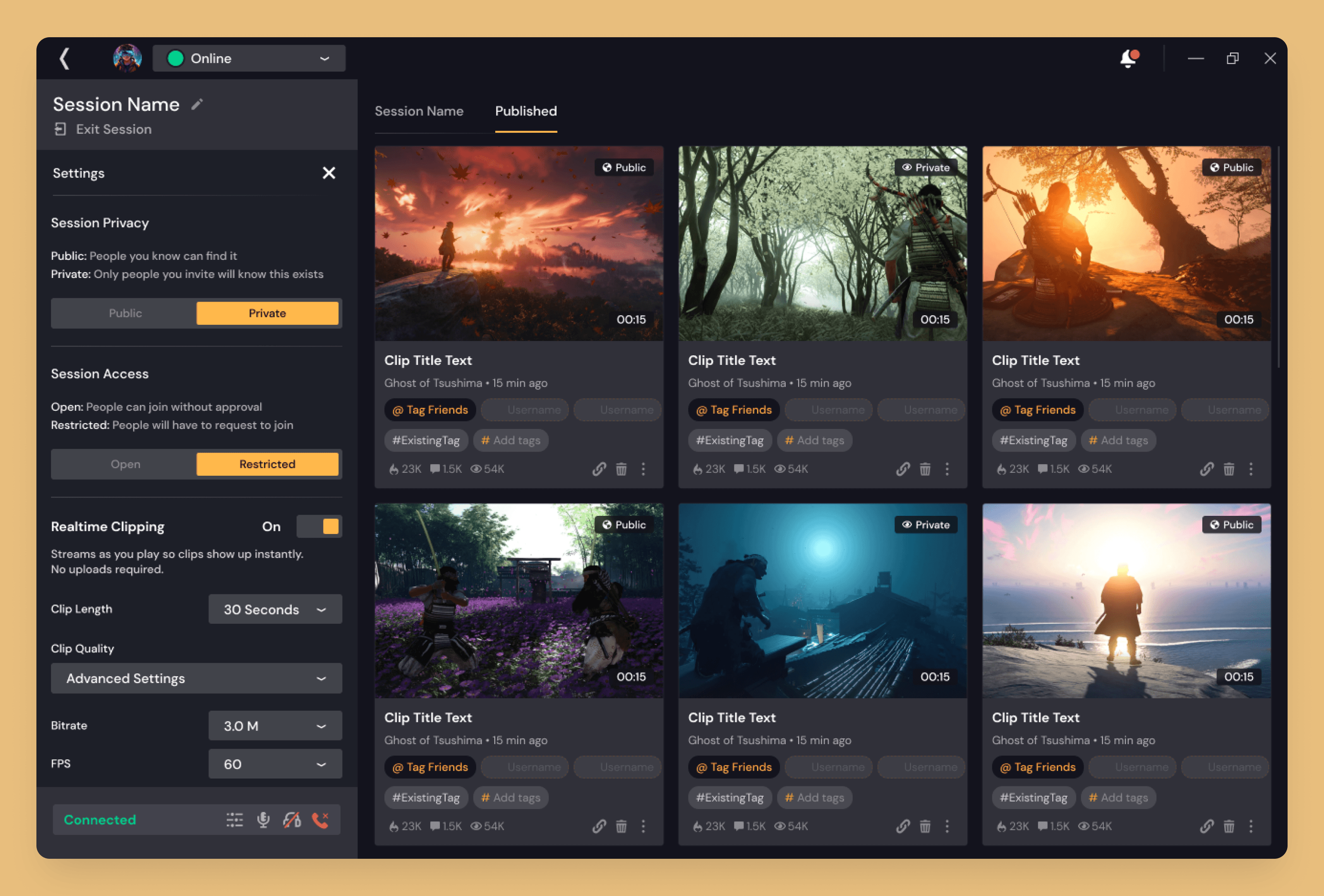 Sessions: A dedicated space for users to play games with one another and share clips from that session in a designated public or private space. Users in a Session can interact with each other through voice and text chat as well as editing each other’s clips and reposting to their own accounts in real-time. Users can also join to see what other players have captured from the most recent session and then engage with those clips and socialize with one another.